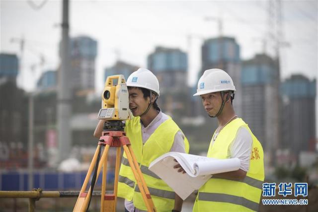 武漢黃家湖大道城市地下綜合管廊及同步道路提升改造工程項目施工員蘭增林(右)、方維在測繪管廊主體。他們是奮戰(zhàn)在軍運會工地上的“90后”新農(nóng)民工(2018年5月14日攝)。新華社記者 肖藝九 攝