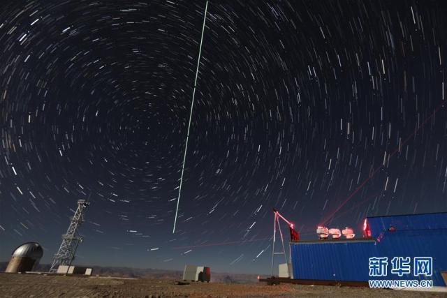 在西藏阿里觀測站,“墨子號”量子科學(xué)實驗衛(wèi)星過境,科研人員在做實驗(2016年12月10日攝,合成照片)。新華社記者 金立旺 攝