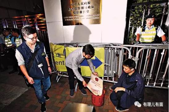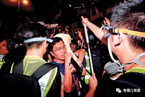 在暴亂現(xiàn)場,“縱暴派”議員區(qū)諾軒站在“指揮臺”位置,與一名白衣神秘男子在天橋上密語,時時關(guān)注形勢變化,通過身旁人傳話,一副指揮行動的派頭。