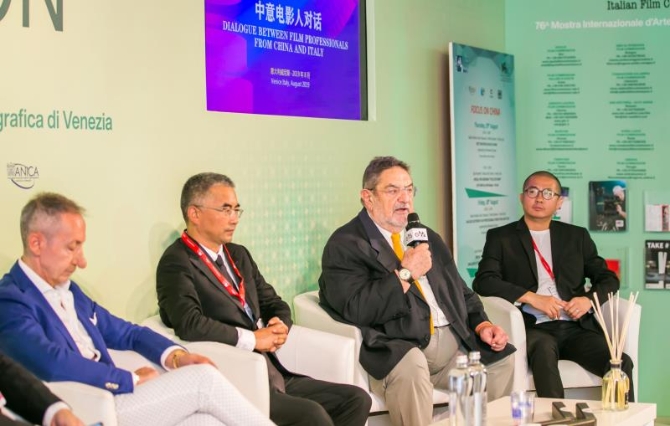 8月30日,第76屆威尼斯電影節(jié)“聚焦中國(guó)”活動(dòng)中意電影人對(duì)話環(huán)節(jié)在威尼斯舉行。意大利知名制片人桑德羅·希爾維斯特(右2)和中國(guó)知名導(dǎo)演萬(wàn)瑪才旦(左2)在活動(dòng)上對(duì)話。