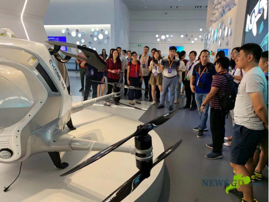 采訪團(tuán)在科學(xué)展廳參觀億航無(wú)人機(jī)。