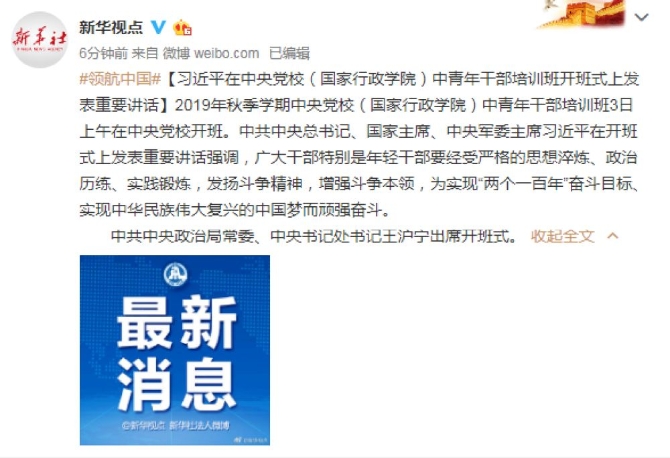 2019年秋季學(xué)期中央黨校(國(guó)家行政學(xué)院)中青年干部培訓(xùn)班3日上午在中央黨校開(kāi)班。中共中央總書(shū)記、國(guó)家主席、中央軍委主席習(xí)近平在開(kāi)班式上發(fā)表重要講話強(qiáng)調(diào),廣大干部特別是年輕干部要經(jīng)受?chē)?yán)格的思想淬煉、政治歷練、實(shí)踐鍛煉,發(fā)揚(yáng)斗爭(zhēng)精神,增強(qiáng)斗爭(zhēng)本領(lǐng),為實(shí)現(xiàn)“兩個(gè)一百年”奮斗目標(biāo)、實(shí)現(xiàn)中華民族偉大復(fù)興的中國(guó)夢(mèng)而頑強(qiáng)奮斗。