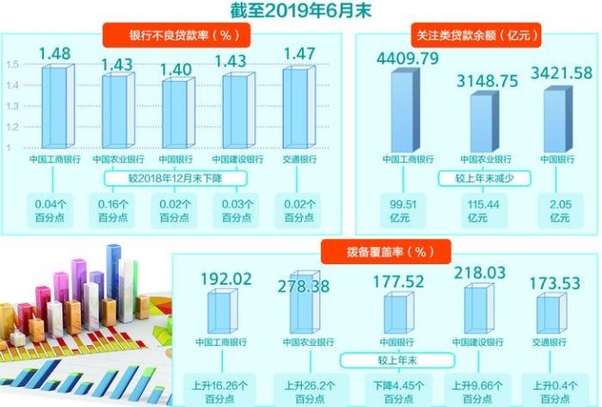 具體來看,截至今年6月末,中國(guó)工商銀行、中國(guó)農(nóng)業(yè)銀行、中國(guó)銀行、中國(guó)建設(shè)銀行、交通銀行的不良貸款率分別為1.48%、1.43%、1.40%、1.43%、1.47%,分別較2018年12月末下降0.04個(gè)百分點(diǎn)、0.16個(gè)百分點(diǎn)、0.02個(gè)百分點(diǎn)、0.03個(gè)百分點(diǎn)、0.02個(gè)百分點(diǎn)。