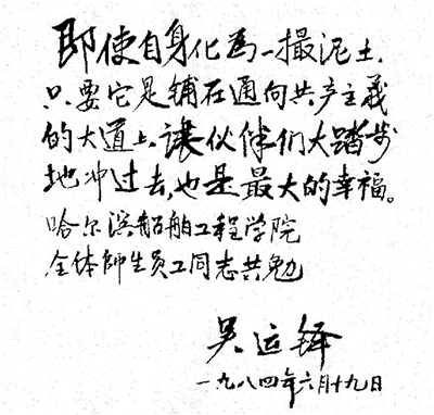 在給張海迪的信中,吳運鐸提到,“只有具有遠(yuǎn)大理想的人,他的精神才永遠(yuǎn)是充實的。這理想,就是為人民的幸福、為國家的富強(qiáng)而奮斗、而獻(xiàn)身?!笔堑模瑓沁\鐸的一生都是在堅守這份遠(yuǎn)大而崇高的理想。為了黨和人民的事業(yè),他奉獻(xiàn)了青春,奉獻(xiàn)了生命,奉獻(xiàn)了所擁有的一切。