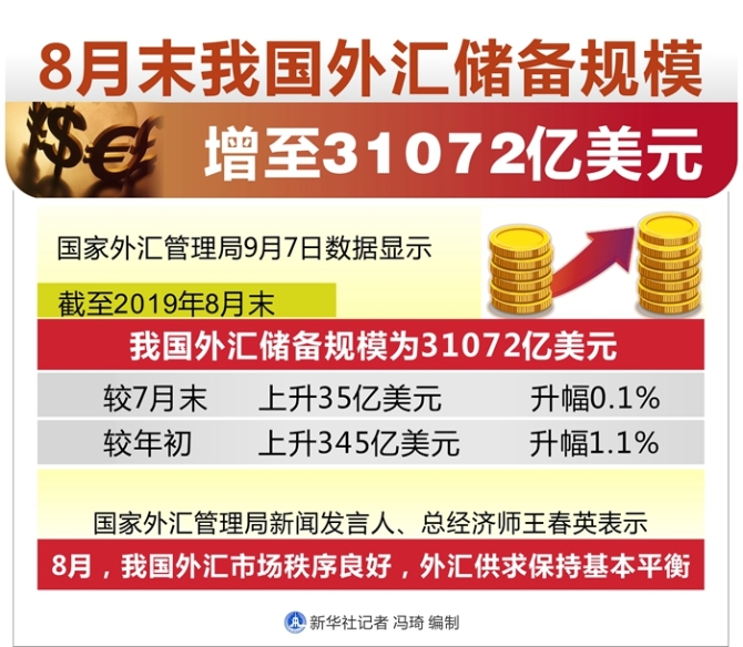 新華社北京9月7日電 記者劉開(kāi)雄 國(guó)家外匯管理局7日數(shù)據(jù)顯示,截至2019年8月末,我國(guó)外匯儲(chǔ)備規(guī)模為31072億美元,較7月末上升35億美元,升幅0.1%;較年初上升345億美元,升幅1.1%。