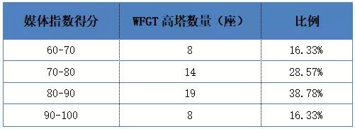 該指數(shù)得分介于60~100,分值越大,媒體報(bào)道數(shù)量越多,品牌傳播力越大。WFGT高塔的媒體指數(shù)得分主要集中在80~90之間,占比超過四成;其次,有14座的得分介于70~80,占比28.57%;媒體指數(shù)介于60~70分和超過90分的均有8座,各占16.33%。