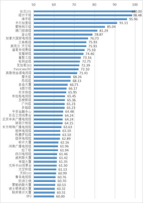 排名介于1%~10%的高塔共占近五成,其中廣州塔、五棱郭塔和臺(tái)北101大廈其絕對(duì)值排名位于前十。