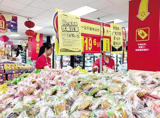 在月餅專區(qū),一家現(xiàn)烤現(xiàn)賣的月餅格外惹市民青睞?!拔覀兪浅D曩u云腿小餅,原價是88元/公斤,從這個周開始降到69.8元/公斤,等過完中秋節(jié)就恢復(fù)原價。”顏女士告訴記者,這幾天買月餅的人特別多,一天能賣出100多公斤。記者在家樂福等超市、商場看到,類似的促銷活動正如火如荼地開展。