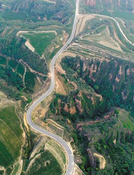 ↑7月18日,無(wú)人機(jī)拍攝的山西省臨汾市浮山縣新建投入使用的農(nóng)村旅游+扶貧公路。高新生 攝