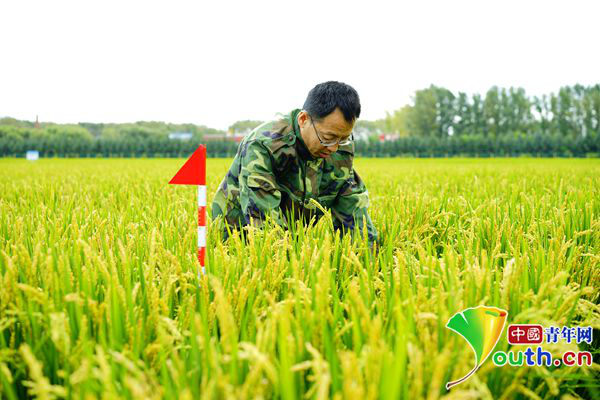 金立軍在試驗(yàn)田里查水稻情況。中國青年網(wǎng)見習(xí)記者 劉逸鵬 攝