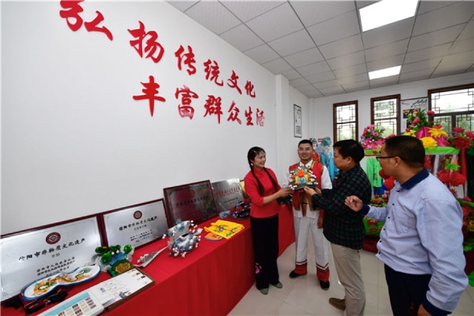 在信陽市光山縣文殊鄉(xiāng)東岳村,村民在村文化中心查看演出道具(9月17日攝)。新華社記者 馮大鵬 攝
