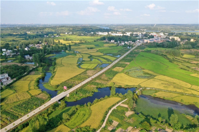 這是信陽市光山縣文殊鄉(xiāng)東岳村附近的稻田美景(9月4日無人機(jī)拍攝)。新華社記者 馮大鵬 攝