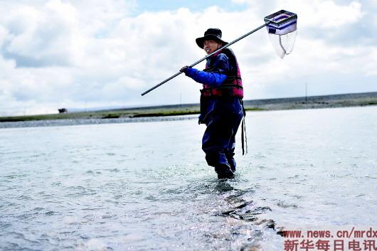 不到兩年時間內(nèi),科考隊員李偉連續(xù)第5次進入江源觀測高原魚類特性。每次,他都穿上防水服、扛上漁網(wǎng)與設備,在冰冷河水中捕魚、采樣。他說:“處于水生態(tài)系統(tǒng)食物鏈頂端的魚類,是水生生物多樣性的重要組成部分,對維護江源水生態(tài)系統(tǒng)安全起到非常重要的作用?!?/p>