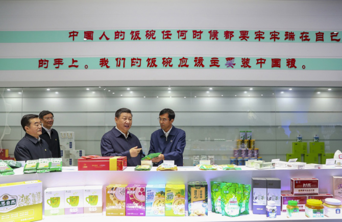 2018年9月25日下午,習(xí)近平在黑龍江北大荒精準(zhǔn)農(nóng)業(yè)農(nóng)機(jī)中心一樓大廳,察看當(dāng)?shù)爻霎a(chǎn)的各類農(nóng)產(chǎn)品。新華社記者 謝環(huán)馳 攝