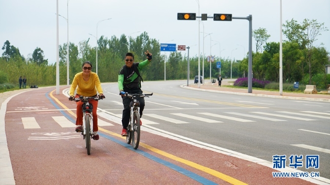 市民在“最美環(huán)湖路”上騎行。新華網(wǎng) 丁凝/攝