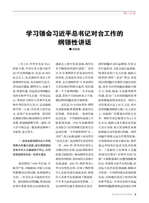 《統(tǒng)一論壇》刊登重要文章三十年來,《統(tǒng)一論壇》雜志宣傳大陸對臺方針政策,開展兩岸交流,關(guān)注島內(nèi)“臺獨”勢力動向,充分發(fā)揮輿論宣傳陣地和思想交流園地作用,成為廣大讀者了解大陸對臺方針政策和兩岸局勢變化、交流愛國思想和統(tǒng)一見解的平臺。