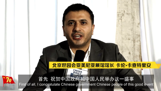 北京世園會亞美尼亞展館館長卡倫?卡查特里安表示,中國開始在世界上扮演重要的角色,很多國家希望與中國建立良好的文化和經(jīng)濟方面的聯(lián)系。祝福新中國70周年生日快樂!
