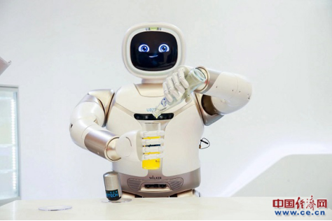 優(yōu)必選Walker機(jī)器人展示倒水功能,該機(jī)器人被《The Robot Report》評(píng)為2019年值得關(guān)注的5大人形機(jī)器人,并入選2019世界人工智能大會(huì)卓越人工智能引領(lǐng)者Top 30。(優(yōu)必選科技供圖)