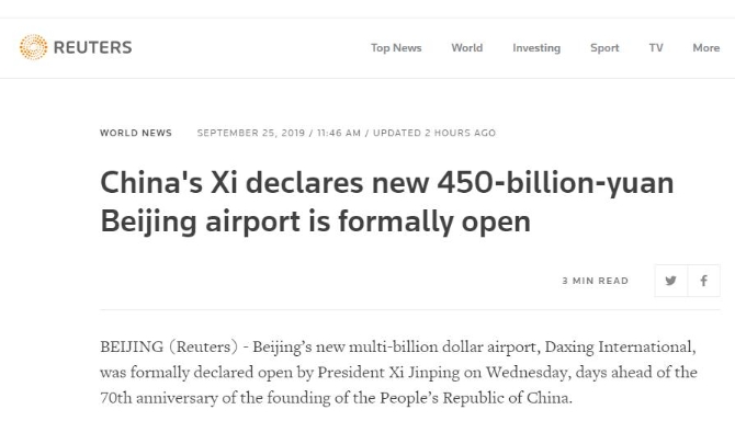 英國路透社25日報道稱,在中華人民共和國成立70周年前夕,北京大興國際機場正式投入運營。這項耗資數(shù)百億美元的浩大工程,在不到5年的時間內(nèi)就完工了,將進一步促進中國基礎設施建設的發(fā)展。