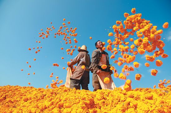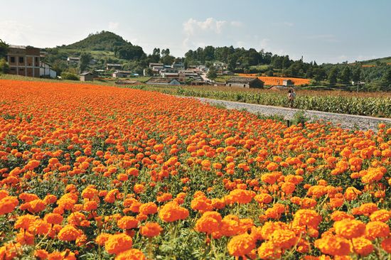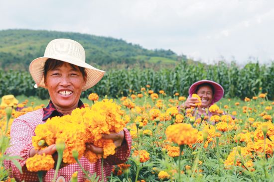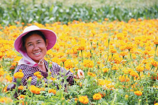 離開(kāi)大布紅村,公路兩側(cè)的田間地頭,三五人一組、八九人一排,到處都是群眾忙著采摘菊花的身影。收購(gòu)點(diǎn)上,農(nóng)戶們喜笑顏開(kāi)地出售萬(wàn)壽菊,臉上洋溢著豐收的喜悅,與金黃色的花朵相互映襯,構(gòu)成了一幅金秋的美麗畫(huà)卷。(作者馬衛(wèi)忠)