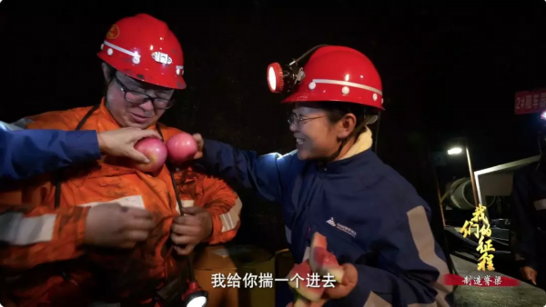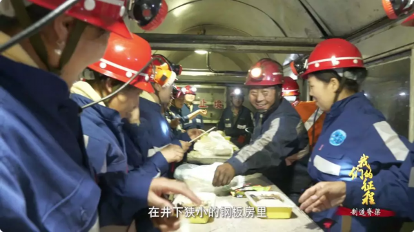 在120米的地層深處,礦嫂們跟丈夫們見面。安全帽下,一張張烏黑的面孔,一時間,很多礦嫂都沒認(rèn)出自己的丈夫。 紀(jì)錄片《我們的征程》第二集精彩片段在井下狹小的鋼板房里,一頓午餐讓人終身難忘。