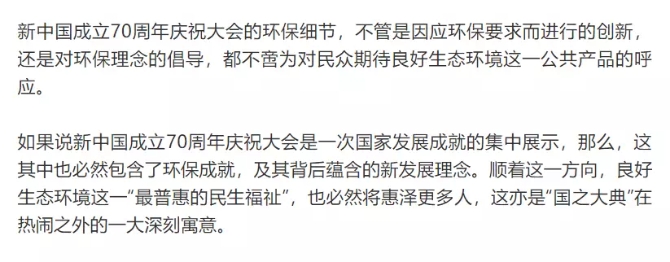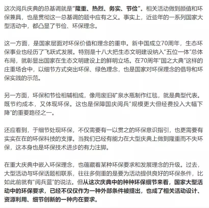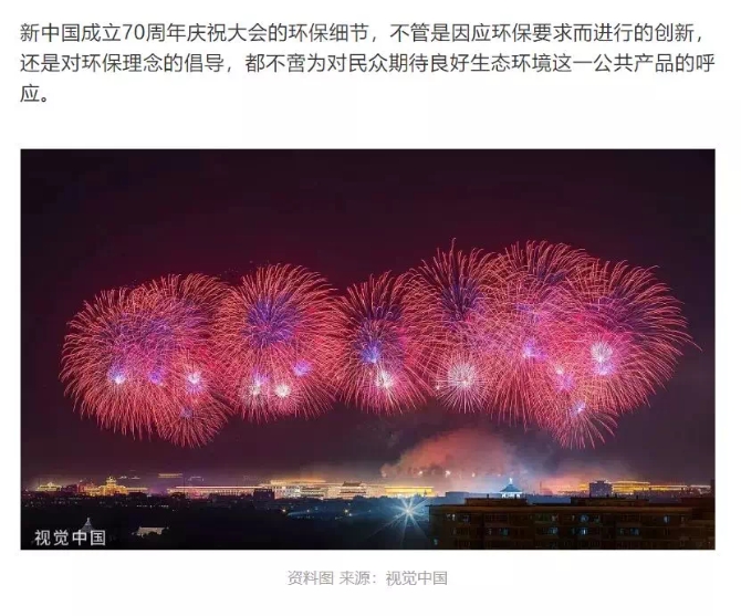 不只是焰火表演,閱兵儀式和聯(lián)歡晚會上,環(huán)保細節(jié)可謂處處可見。