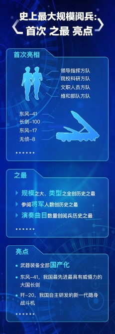 此次閱兵是中國特色社會(huì)主義進(jìn)入新時(shí)代的首次國慶閱兵,也是人民軍隊(duì)改革重塑后的首次集中亮相。閱兵活動(dòng)亮點(diǎn)紛呈,規(guī)模之大、類型之全創(chuàng)歷史之最,編組之新、要素之全體現(xiàn)強(qiáng)軍成果。