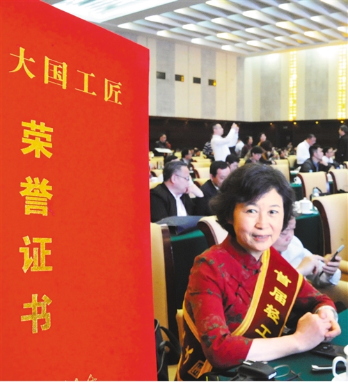 河南省開封市線象藝術(shù)研究院苗煒在廣西南寧市出席“大國工匠”表彰大會。她設(shè)計和參與繡制的大量刺繡作品,創(chuàng)造了非常可觀的經(jīng)濟效益和社會效益。 高新生攝(中經(jīng)視覺)