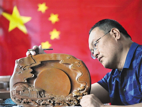 山西省新絳縣,全國勞模、絳州澄泥硯研制所所長藺濤在修飾建國系列硯臺產(chǎn)品。 高新生攝(中經(jīng)視覺)