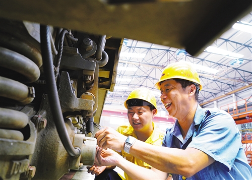 中車戚墅堰機車車輛工藝研究所有限公司首席技能專家劉云清(中),是一位從機修鉗工成長為數(shù)控設(shè)備維修專家的“中國質(zhì)量工匠”。 工人日報記者 楊登峰攝