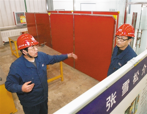 中車唐山軌道客車有限責任公司鋁合金廠高級技師、數(shù)控裝調(diào)維修高級技師張雪松(左),參與了復興號動車組鋁合金車體生產(chǎn)線的自動化、智能化改造。工人日報記者 楊登峰攝