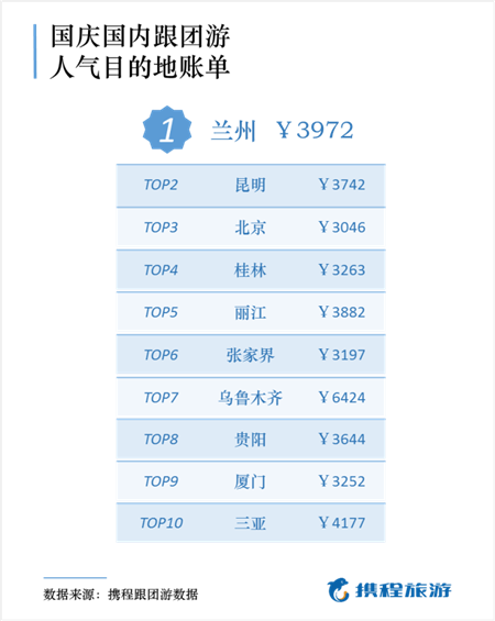 報(bào)告顯示,最受游客歡迎的國(guó)內(nèi)旅游城市前十分別是蘭州、昆明、北京、桂林、麗江、張家界、烏魯木齊、貴陽(yáng)、廈門(mén)和三亞。分析顯示,今年國(guó)慶黃金周,適逢中華人民共和國(guó)成立70周年,眾多游客選擇前往北京旅游;憑借宜人的氣候以及豐富的旅游資源等,昆明也受到眾多國(guó)內(nèi)游客青睞。