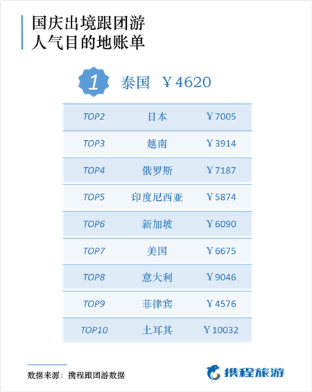 綜合跟團(tuán)游和自由行訂單情況,泰國(guó)、日本、越南、俄羅斯、印度尼西亞、新加坡、美國(guó)、意大利、菲律賓和土耳其,是今年國(guó)慶黃金周人氣最旺的十大出境游目的地。其中,人氣最高的泰國(guó),單次旅游人均花費(fèi)達(dá)到4620元;而在對(duì)中國(guó)游客開(kāi)放電子簽政策,赴日簽證進(jìn)一步簡(jiǎn)化以及周杰倫《說(shuō)好不哭》MV發(fā)布等因素拉動(dòng)下,赴日旅游出現(xiàn)近三成的增長(zhǎng),成為今年國(guó)慶黃金周自由行最大贏家,單次旅游人均花費(fèi)達(dá)到6879元。