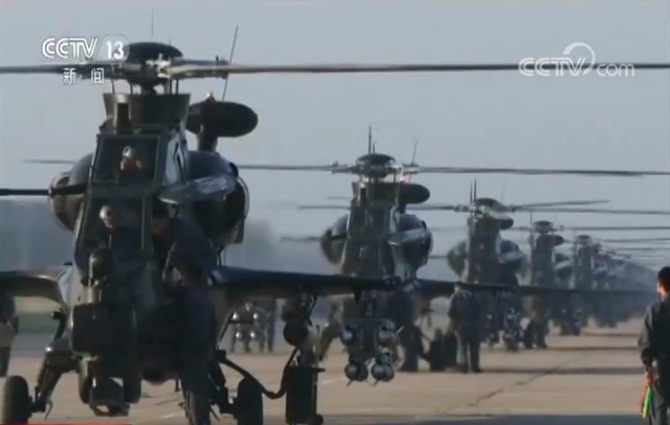 在10月1日的國慶閱兵式上,由陸航直升機(jī)組成的“空中儀仗隊”拉開分列式的序幕,他們用完美精準(zhǔn)的技術(shù)完成了掛旗和“70”字樣的編隊任務(wù),而空中突擊梯隊首次成建制展示作戰(zhàn)編組也成為此次閱兵中的亮點。這次參閱的5型69架直升機(jī),全部為國產(chǎn)主戰(zhàn)機(jī)型。多機(jī)型混編的高密度飛行,展現(xiàn)出陸航直升機(jī)部隊精確定位、多機(jī)協(xié)同的高超技巧。