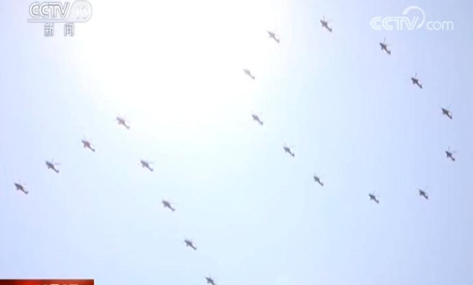 陸航空中護(hù)旗梯隊由29架直升機(jī)組成,3架直-8B運輸直升機(jī)分別懸掛中國共產(chǎn)黨黨旗、中華人民共和國國旗、中國人民解放軍軍旗,6架直-10武裝直升機(jī)組成左右僚機(jī)實施護(hù)衛(wèi)。緊隨其后的,是由8架直-10武裝直升機(jī)和12架直-19武裝直升機(jī)組成的“70”字樣。