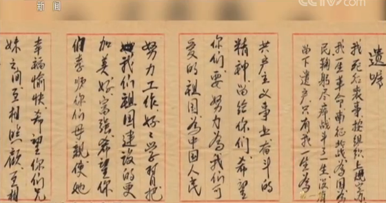 遺囑表示:我的一生革命南征北戰(zhàn),為國為民鞠躬盡瘁,戰(zhàn)斗了一生,沒有留下遺產(chǎn)。我把一生為共產(chǎn)主義事業(yè)奮斗的精神留給你們,希望你們要努力為我們可愛的祖國,為我們中國人民努力工作,好好學(xué)習(xí),把我們祖國建設(shè)得更加美好富強(qiáng)。