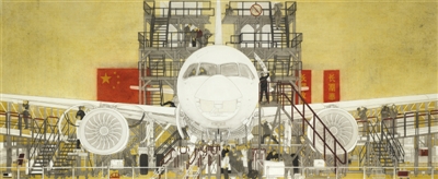 范春曉中國(guó)畫(huà)《中國(guó)制造走向世界——C919大飛機(jī)》。