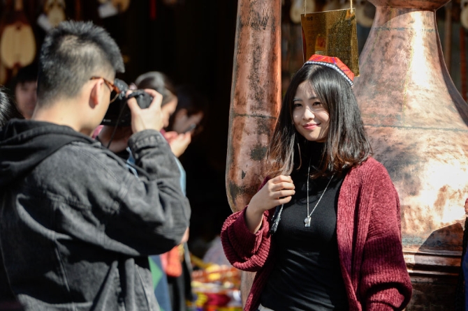 10月5日,游人在烏魯木齊市大巴扎景區(qū)拍照留念。新華社記者 丁磊 攝