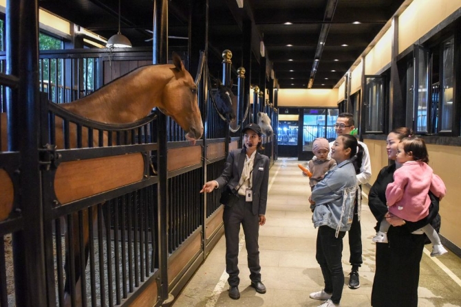 游人在新疆古生態(tài)園汗血馬基地參觀(10月1日攝)。新華社記者 丁磊 攝