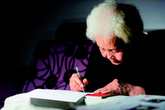 姜淑梅老人在家中寫作(9月24日攝)。 謝劍飛攝