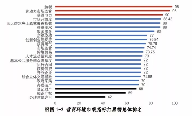 市級(jí)指標(biāo)的考評(píng)結(jié)果顯示,納稅、勞動(dòng)力市場(chǎng)監(jiān)管、獲得電力指標(biāo)綜合得分排名前三,進(jìn)入“紅榜”;登記財(cái)產(chǎn)、知識(shí)產(chǎn)權(quán)、辦理建筑許可綜合得分排名后三位,進(jìn)入“黑榜”。