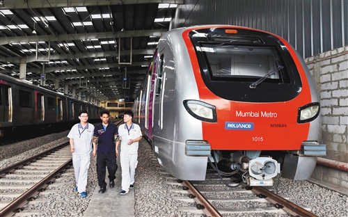 印度孟買地鐵一號(hào)線于2014年6月8日正式運(yùn)行,該地鐵線路車輛由中車南京浦鎮(zhèn)車輛有限公司制造。圖為中印雙方工作人員在孟買地鐵一號(hào)線車輛段工作。(新華社發(fā))