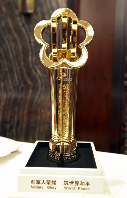 軍運(yùn)會獎杯名為“騰飛”,以梅花、抽象的和平鴿為設(shè)計主元素,與軍運(yùn)會會徽的數(shù)字“7”、跑道、祥云圖形組合構(gòu)成。一飛沖天的和平鴿造型,既體現(xiàn)“共筑世界和平”之意,也寓意運(yùn)動員拼搏、向上,再創(chuàng)世界軍運(yùn)會佳績。