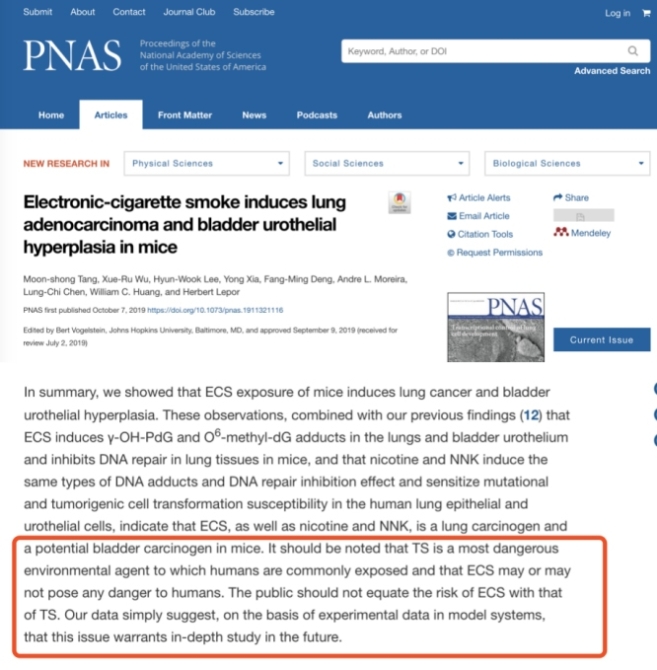 紐約大學(xué)醫(yī)學(xué)院研究團隊的實驗中,實驗鼠54周內(nèi)接觸到的煙霧量,相當于成年人定期抽電子煙3到6年的量,據(jù)此才得出電子煙煙霧會讓實驗鼠“膀胱增生,患癌風險增加”的結(jié)論。在現(xiàn)實中不可能會出現(xiàn)如此高的煙霧濃度,也不會有人連續(xù)這么久處于煙霧之中。事實上,研究團隊在論文結(jié)尾也特別強調(diào):根據(jù)實驗?zāi)P偷贸龅臄?shù)據(jù),僅表明該問題值得進一步研究。
