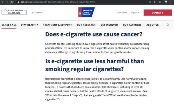 “研究發(fā)現(xiàn),使用電子煙對成年人的危害顯著低于普通香煙。香煙燃燒會產(chǎn)生7000多種化學(xué)物質(zhì),其中至少70種是明確的致癌物,而電子煙不存在這個問題。”美國癌癥協(xié)會在回應(yīng)中進一步指出,“我們鼓勵人們從傳統(tǒng)香煙轉(zhuǎn)換為電子煙。”