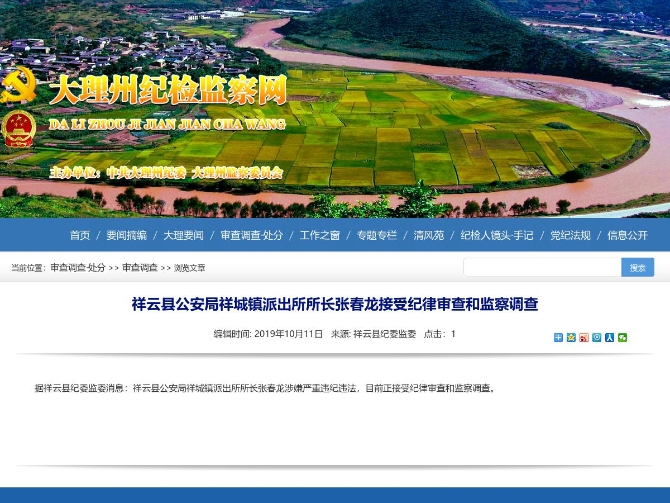 昆明信息港訊 機器人小明 據(jù)祥云縣紀委監(jiān)委消息:祥云縣公安局祥城鎮(zhèn)派出所所長張春龍涉嫌嚴重違紀違法,目前正接受紀律審查和監(jiān)察調(diào)查。