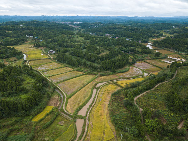 無人機(jī)拍攝的四川省樂至縣三河咀村的稻田 李昕鋒 攝
