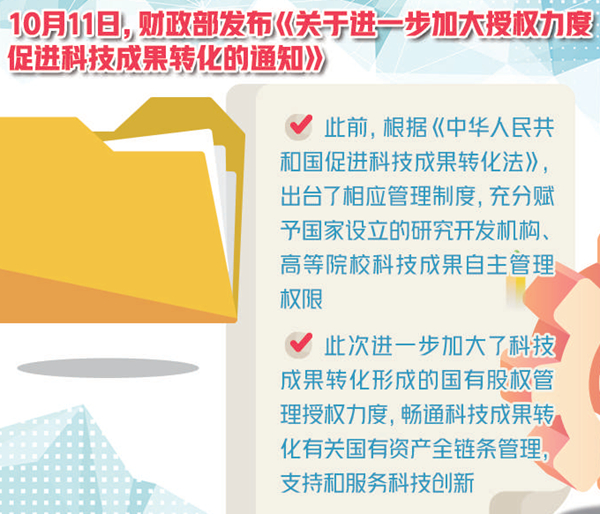 長(zhǎng)期以來(lái),科技成果轉(zhuǎn)化中涉及國(guó)有資產(chǎn)審批鏈條長(zhǎng)、管理文件多等問(wèn)題,困擾著不少?gòu)臉I(yè)人員。10月11日,科技成果轉(zhuǎn)化領(lǐng)域迎來(lái)重要政策突破,財(cái)政部發(fā)布《關(guān)于進(jìn)一步加大授權(quán)力度 促進(jìn)科技成果轉(zhuǎn)化的通知》,進(jìn)一步加大國(guó)家設(shè)立的中央級(jí)研究開(kāi)發(fā)機(jī)構(gòu)、高等院??萍汲晒D(zhuǎn)化有關(guān)國(guó)有資產(chǎn)管理授權(quán)力度,暢通科技成果轉(zhuǎn)化有關(guān)國(guó)有資產(chǎn)全鏈條管理,促進(jìn)科技成果轉(zhuǎn)移轉(zhuǎn)化。
