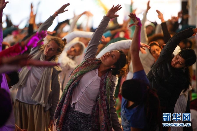 這是來自世界各地的瑜伽練習者在印度北阿肯德邦里希蓋什舉行的第16屆國際瑜伽節(jié)開幕式上做瑜伽動作(2015年3月1日攝)。新華社記者 鄭煥松/攝