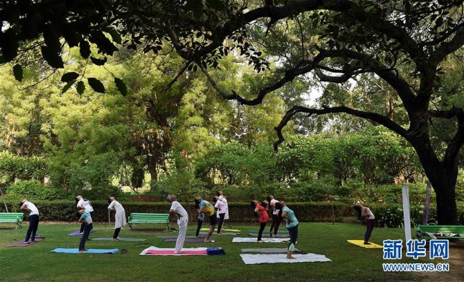 這是在印度新德里,人們在公園練習瑜伽(2019年6月21日攝)。 新華社記者 張迺杰/攝